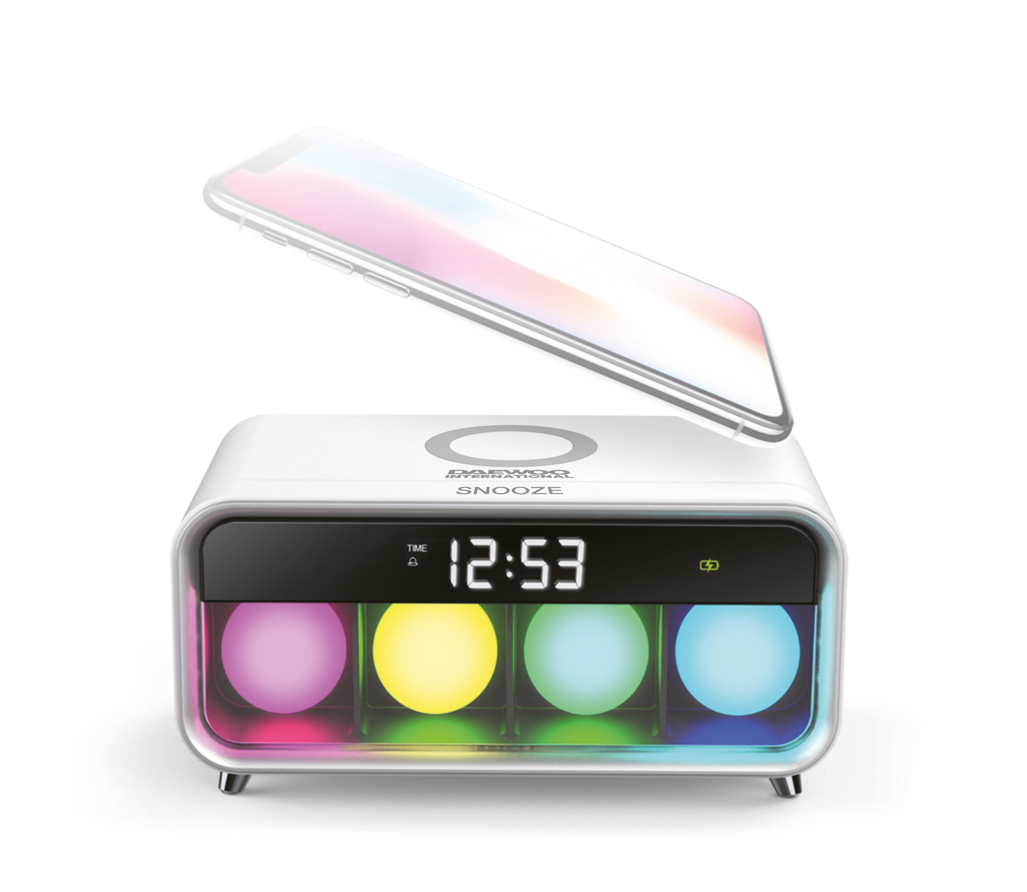 Ασύρματος φορτιστής κινητών τηλεφώνων της Daewoo. Είναι ρολόι-ξυπνητήρι και έχει λυχνίες φωτισμού RGB.