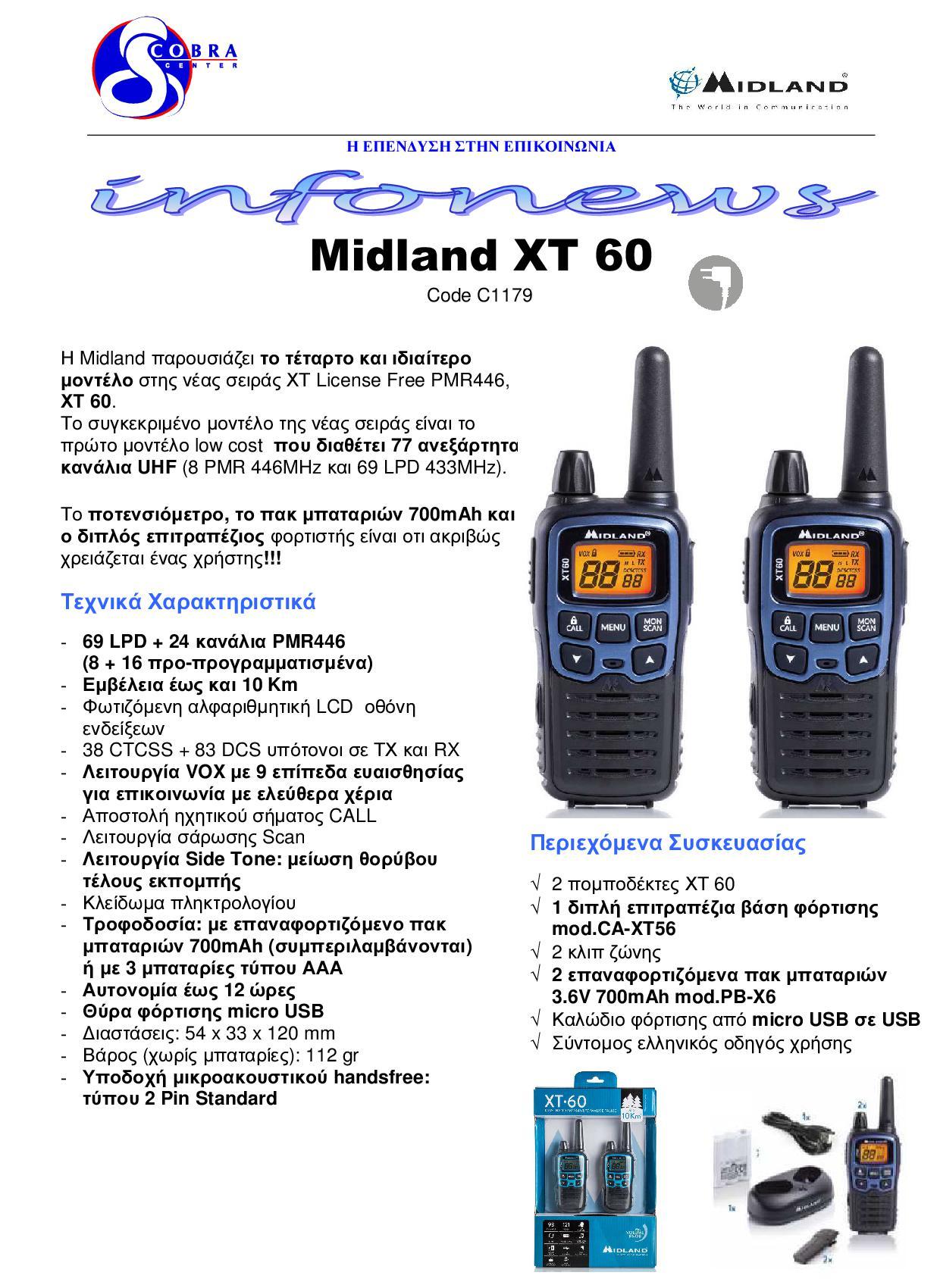 Το XT 60 της Midland είναι ένας πομποδέκτης με 69 κανάλια LPD και 24 κανάλια PMR, όπου τα 16 είναι προ-προγραμματιζόμενα. Εχει φωτιζόμενη οθόνη LCD και εμβέλεια έως 10km. Επισης, έχει θύρα φόρτισης micro USB και αυτονομία έως 12 ώρες.