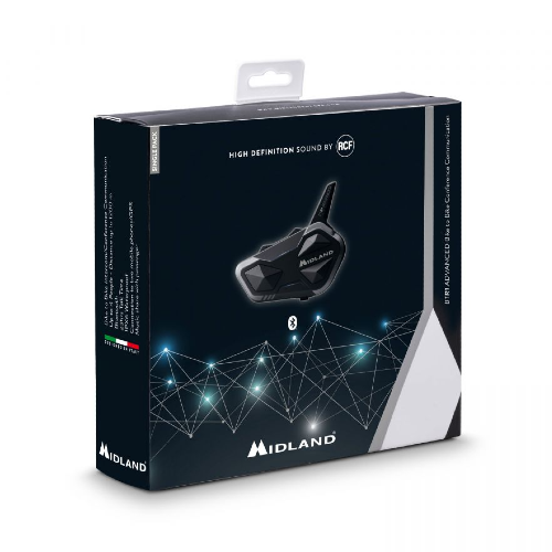 Το BT R1 ADVANCED της Midland προσφέρει αυτονομία μπαταρίας έως και 23 ώρες συνεχόμενης λειτουργίας και είναι συμβατό με κινητά smartphones, πλοηγούς GPS, TFT συστήματα, ενδοεπικοινωνίες άλλης μάρκας και άλλου μοντέλου. Έχει δυνατότητα επιλεκτικής επικοινωνίας ένας προς ένας έως και 4 ατόμων, ταυτόχρονης επικοινωνίας (BT conference) έως και 4 ατόμων με μέγιστη εμβέλεια 1.200μ. Διαθέτει ψηφιακό Φίλτρο Θορύβου DNK (Digital Noise Killer), ραδιόφωνο FM stereo+RDS. Επίσης, έχει δυνατότητα σύνδεσης 2 κινητών τηλεφώνων/GPS, αδιαβροχοποίηση κατά IPX6 και ηχεία HI-FI Power Super Bass της RCF.