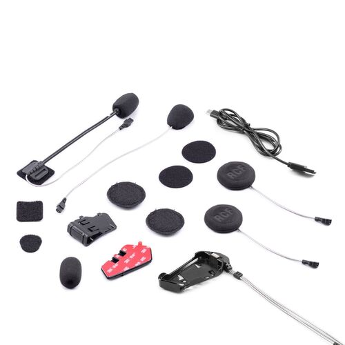 Περιεχόμενα συσκευασίας: Ενα BT R1 ADVANCED X, ένα κιτ ήχου με ηχεία 40mm υψηλής απόδοσης από την RCF, δύο δερμάτινα προστατευτικά μαξιλαράκια μπάσων, δύο αποστάτες ηχείων, ένα κιτ μικροφώνων αποτελούμενο από ένα ενσύρματο μικρόφωνο για κλειστό κράνος και ένα μικρόφωνο boom με βραχίονα για ανοιγόμενο κράνος, ένα κιτ γρήγορης εγκατάστασης με μία βάση με αυτοκόλλητη ταινία διπλής όψεως για στήριξη στα κράνη και ένα καλώδιο USB-C.