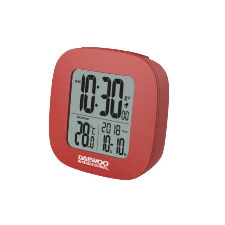 Ψηφιακό ρολόι-ξυπνητήρι της Daewoo, LCD οθόνη με ένδειξη ώρας, θερμοκρασίας και ημερομηνίας. Διαθέτει λειτουργία σίγασης, είναι μικρό σε μέγεθος και έχει φινίρισμα αλουμινίου.